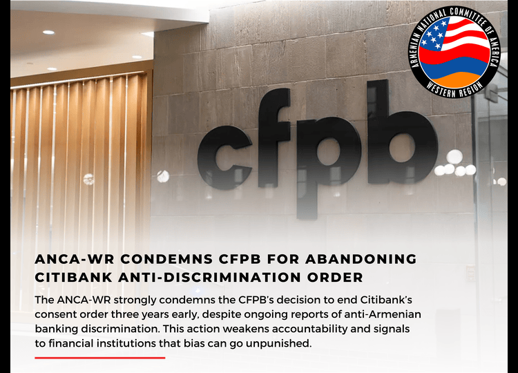 Los Angeles, CA - The Armenian National Committee of America – Western Region (ANCA-WR) strongly condemns the decision by the Consumer Financial Protection Bureau (CFPB) to terminate its enforcement order against Citibank three years earlier than scheduled in a case involving discriminatory credit-card application practices against Armenian-Americans.
